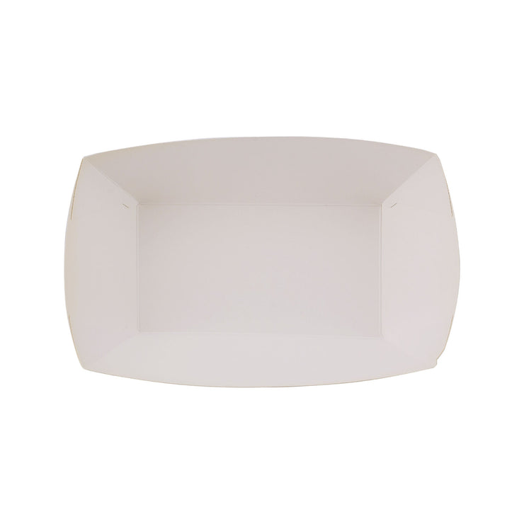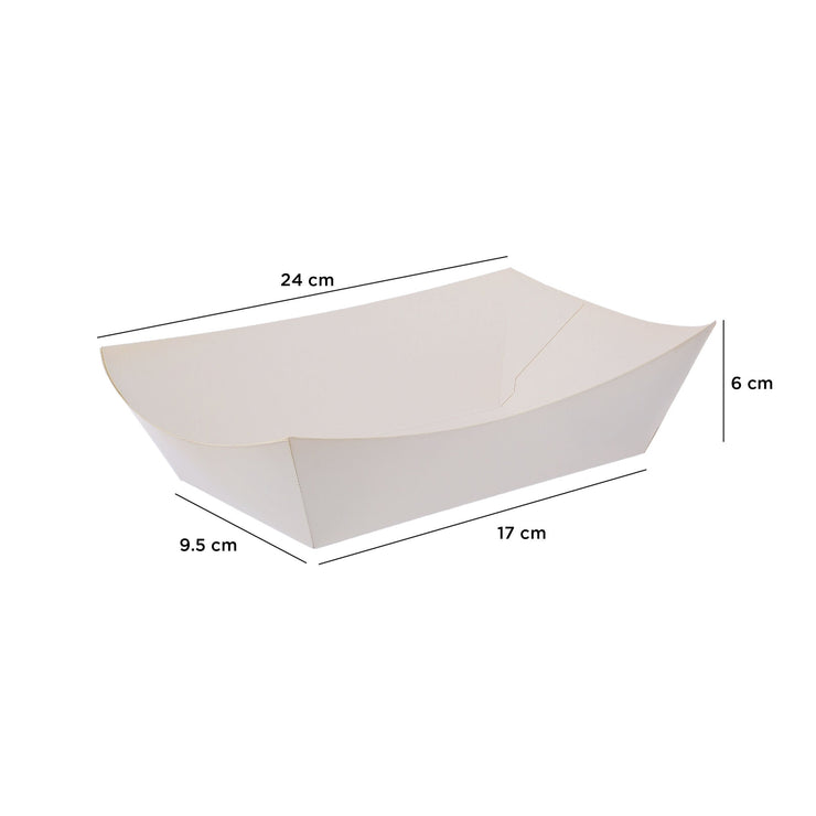 The perfect solution for serving snacks, appetizers, and finger foods in a fun and unique way! These boat-shaped trays are made from high-quality white paper, making them sturdy and durable for holding various food items.